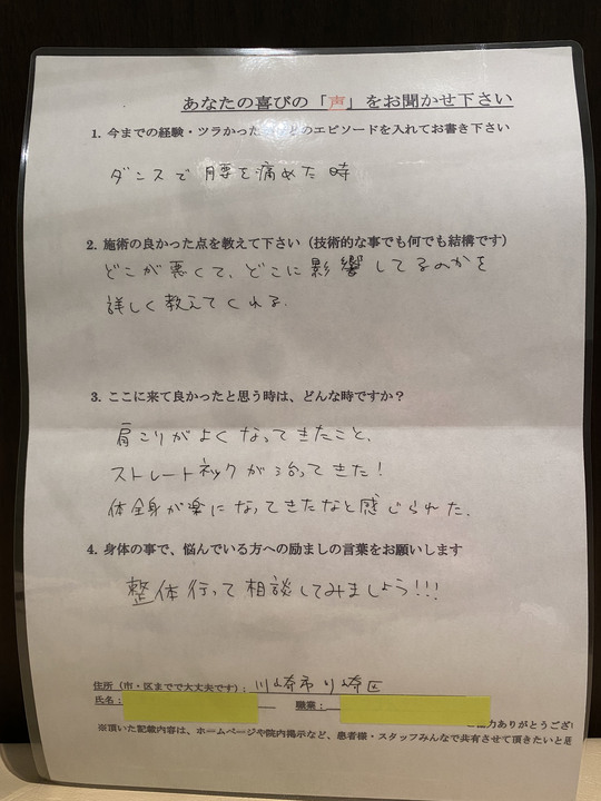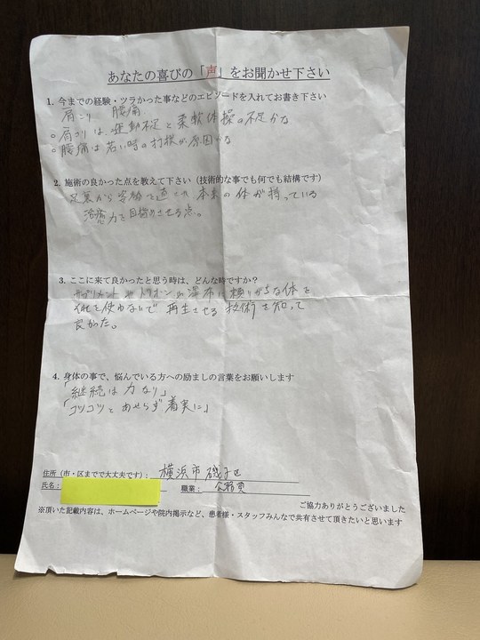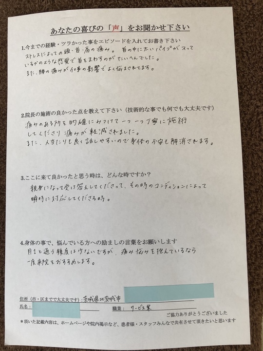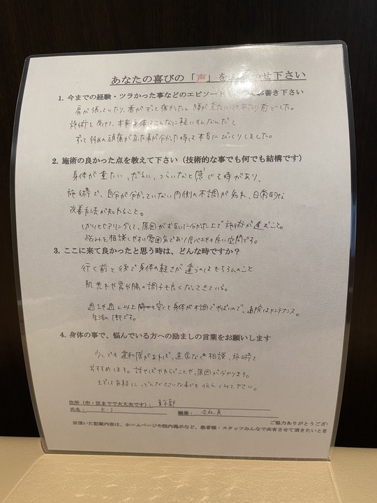 徐々に首や肩の痛み、辛さがなくなり改善されたようで良かったです。
